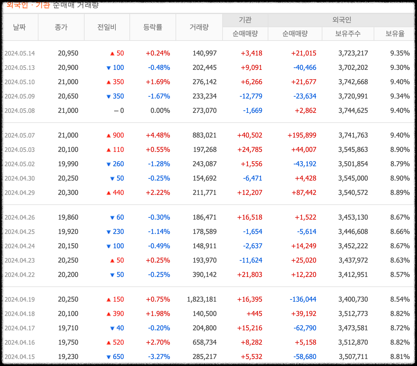 주가 영향에 미치는 투자자들의 매매동향도 한번 살펴보도록 하겠습니다.