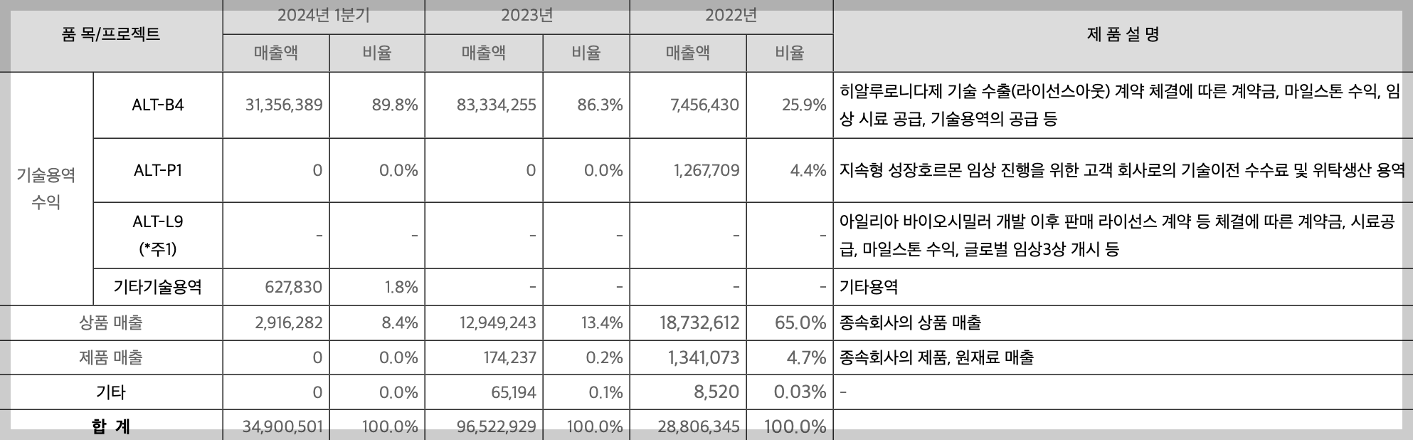 어제 알테오젠 기업 IR 보고서에 대한 부분이 발표가 되어서 정리해서 이야기해 보도록 하겠습니다. 위는 매출과 비율에 대해서 설명한 표이며, 알테오젠의 주요 제품에 대해서도 알아보도록 하겠습니다.