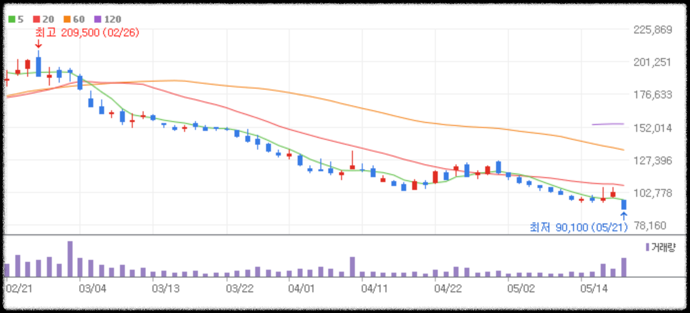 5월 21일 월요일부터 HLB에 이어서 좋지않은 소식으로 에코프로머티리얼즈의 주가가 급락을 하게 되었습니다.