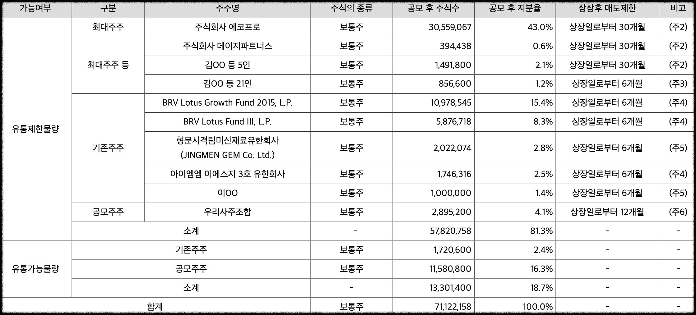 최대주주에코프로는 주식수가 30,559,067주로 43% 차지를 하며 상장일로부터 30개월이 지나야 매도를 할 수 있습니다.