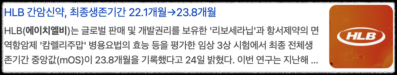 HLB는 2일전 간암신약에 대한 부분을 최종생존기간 22.1개월에서 1년 7개월 늘린 23.8개월이라고 발표를 하였습니다. 리보세라닙과 항서제약의 면역항암제 '캄렐리주맙' 병용요법의 효능을 평가하였던 임상 3상 시험에서 나온 결과 값이며, 이런 부분은 리보세라닙에는 문제가 현재 없고, FDA 재승인을 위한 항서제약의 면역항암제 '캄렐리주맙' 병용요법에 대해서 보완을 할 것이라고 밝혔습니다.