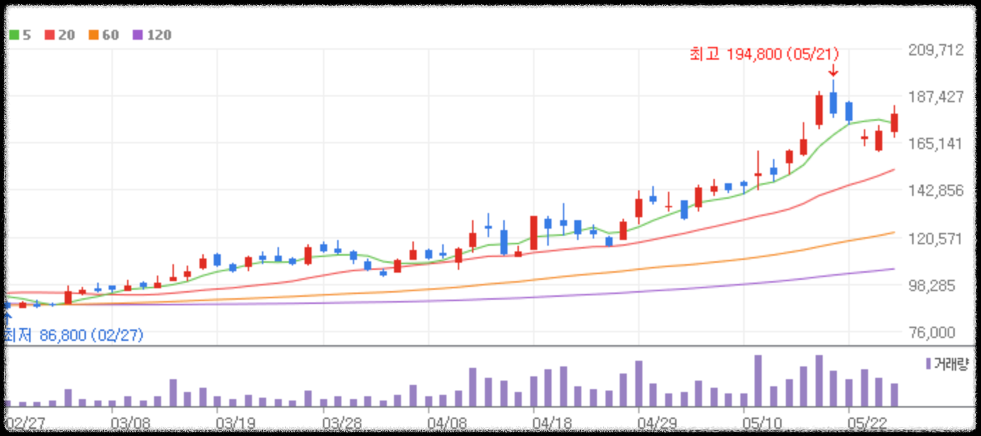 LS 주가 전망 분석에 대해서 알아보도록 하겠습니다. 직전 최고가인 194,800원까지 상승을 하였으나 글로벌 시장이 좋지 않아 한때 하락을 하였으며, 현재는 하락을 멈추고 다시 상승을 하고 있는 것을 알 수 있습니다.