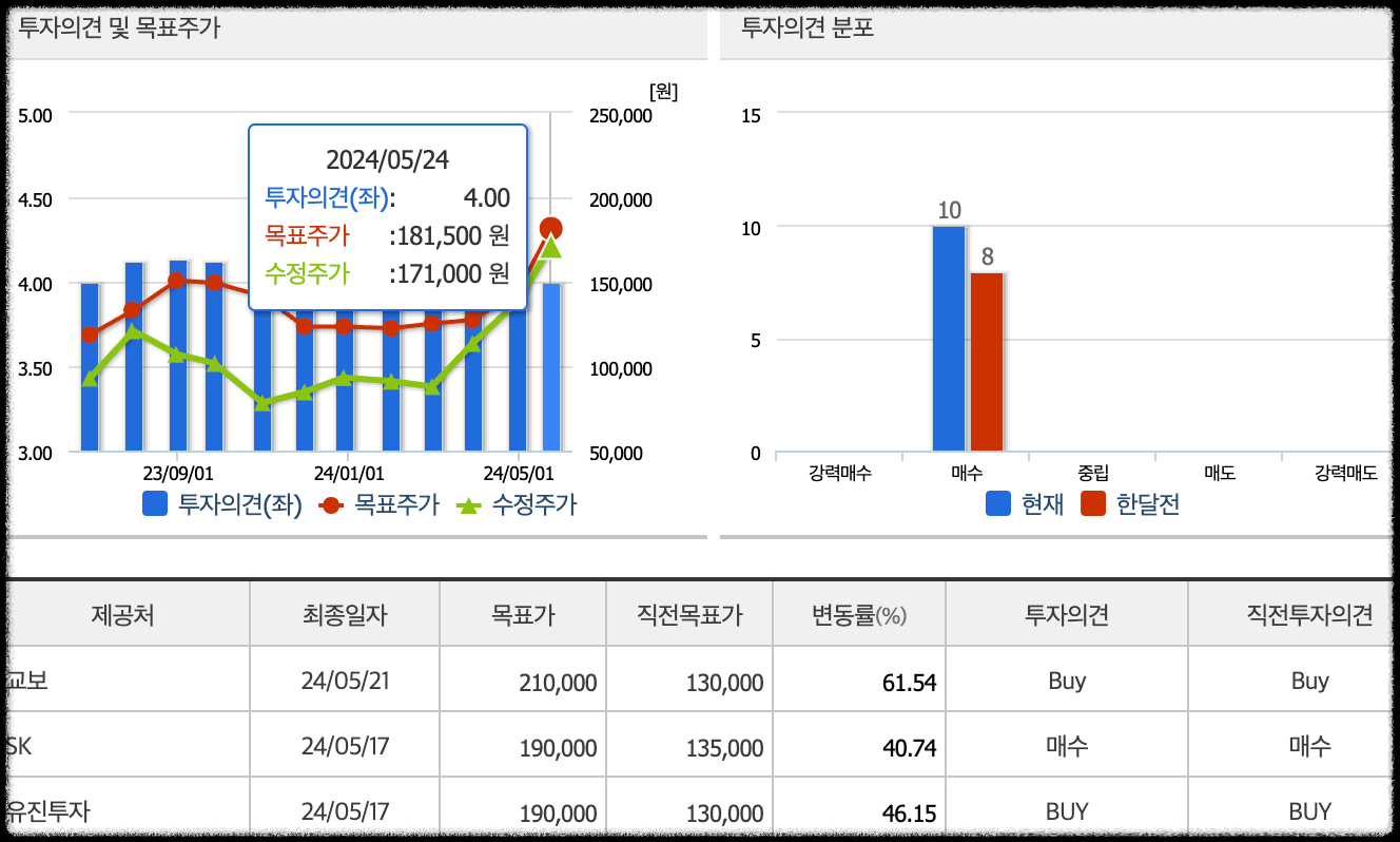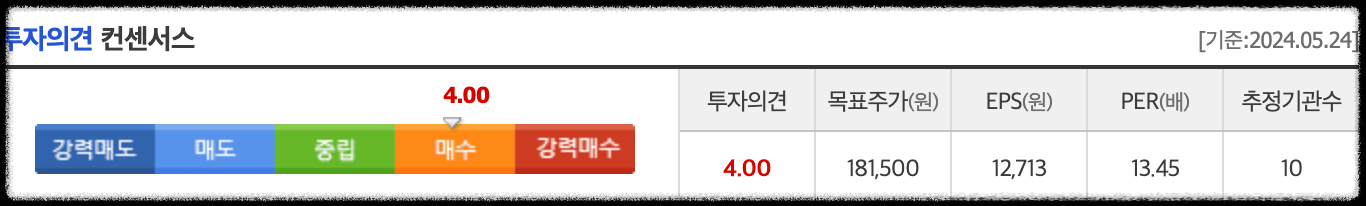 현재 LS 주가 투자의견의 기준은 2024년 5월 24일 기준이며, 목표주가 181,500원 유지를 하고 있으며, LS의 EPS는 12,713원, PER는 13.45배로 기록하고 있으며 10개의 기관에서 매수를 유지 중입니다.
