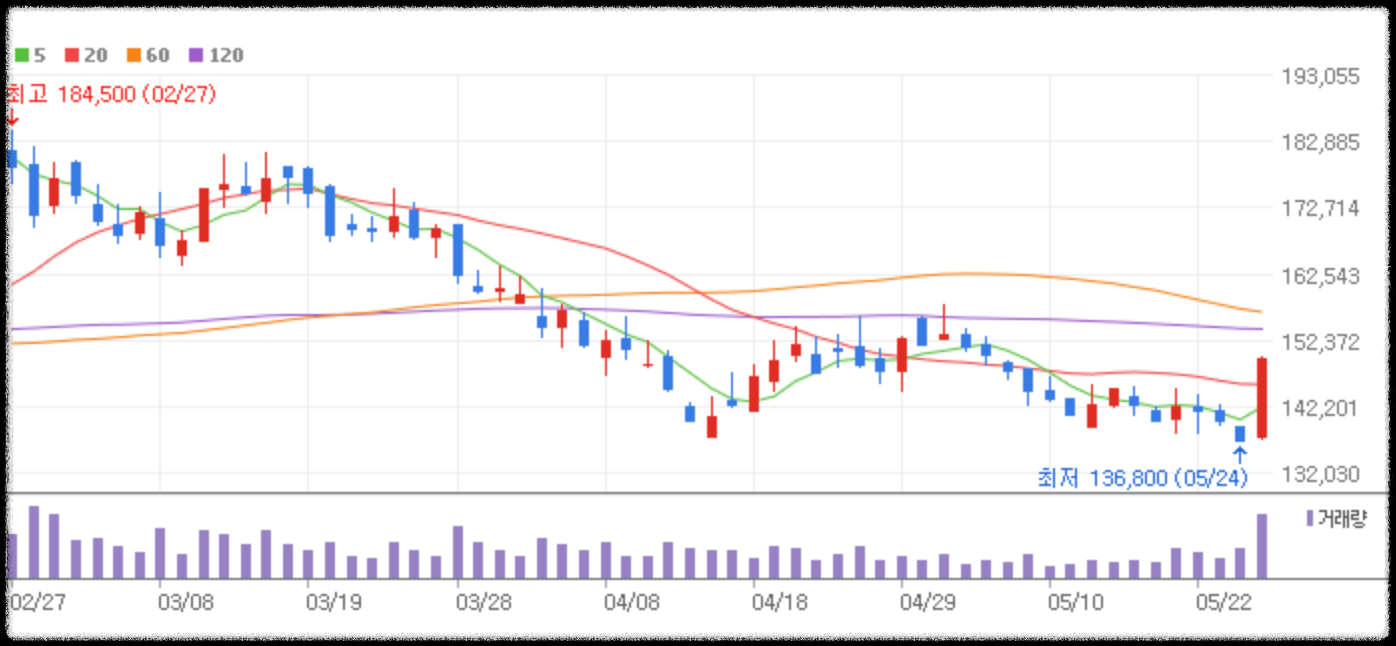 현재 주가는 8.54% 상승한 148,600원이며, 오랜만에 급등을 하여 주식을 가지고 있었는 주주분들에게는 좋은 소식이 아닐수없습니다.