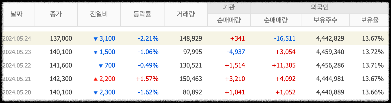 5월 20일부터 현재까지 기관투자자와 외국인투자자 매매동향을 보게 되면 하루빼고 순매수를 보여지고 있어서 이부분은 긍정적이나 크게 상승을 하면 차익 매물로 인해서 하락을 할 것인지, 더욱 매수를 하여 상승을 도와줄 것인지 확인을 하는 것이 좋습니다.