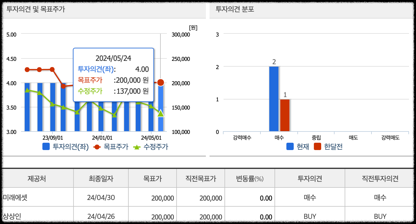 코스모신소재 목표주가를 확인하면 2개의 증권사에서 200,000원으로 목표가로 발표를 하였습니다.