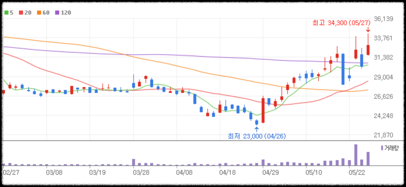 하지만 5월 장대음봉으로는 글로벌시장이 좋지않은 모습을 보였을 때 이동평균선을 깨며 주가가 하락하는 듯하였으나 지난주에 하락한 주가를 상승으로 마감을 하여 현재 5월 27일 신고가를 경신한 모습을 보이고 있습니다.