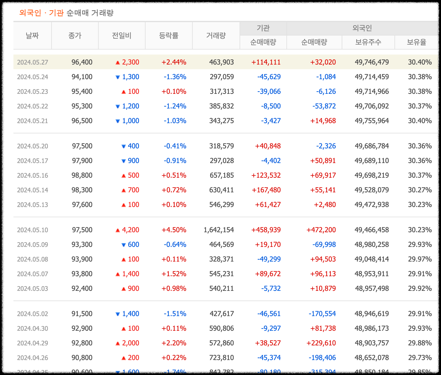 마지막으로 투자자 매매동향을 지켜보면 5월 21일부터 5월 27일까지는 매도세가 강하게 보이는데 5월 28일 이후 매매동향을 지켜보는 것이 좋으며, 외국인 지분율이 높은 LG전자인만큼 외국인이 매도를 하는지 매수를 하며 매집을 하고 있는지 계속 지켜보아야 하는 부분이며입니다. 이번주가 그 시점으로 보이기 때문에 관심이 있으신 분들이라면 잘 살펴보시고 기업에 대한 공부를 더욱 해보시는 것을 추천드립니다.