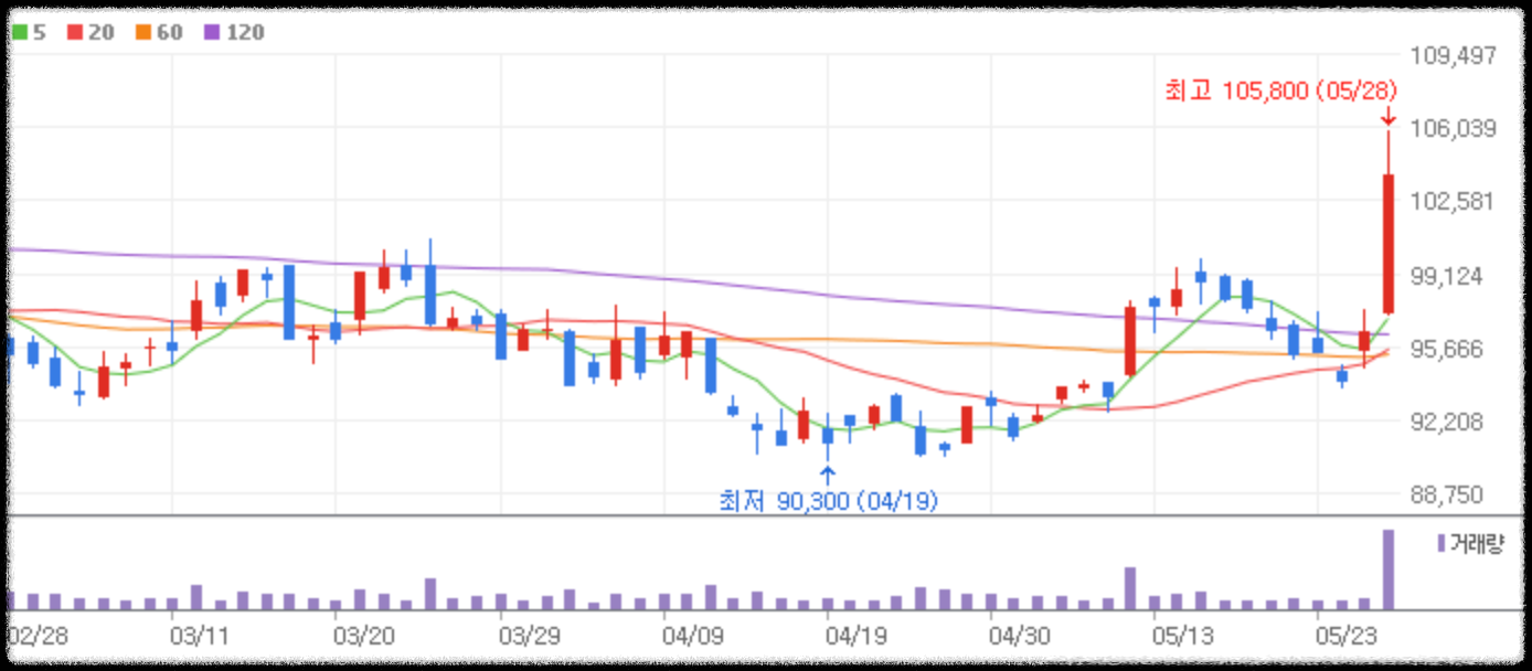 LG전자 역사적 신고가는 193,000원으로 현재 그 이후 많은 하락을 보여주었고 4월 19일 최저 주가인 90,300원을 기록하기도 하였지만 바닥에서 반등을 하며, 주춤하였던 주가가 금일 많은 상승을 한 것을 보여주고 있습니다. 일봉차트로 보았을 때에는 현재 이동평균선이 모아지면서 장대양봉을 보여주며 상승한 것으로 보아서 웹 OS와 AI센터 발열로 인하여 호재로 작용하고 있는 것으로 보이고 있습니다.