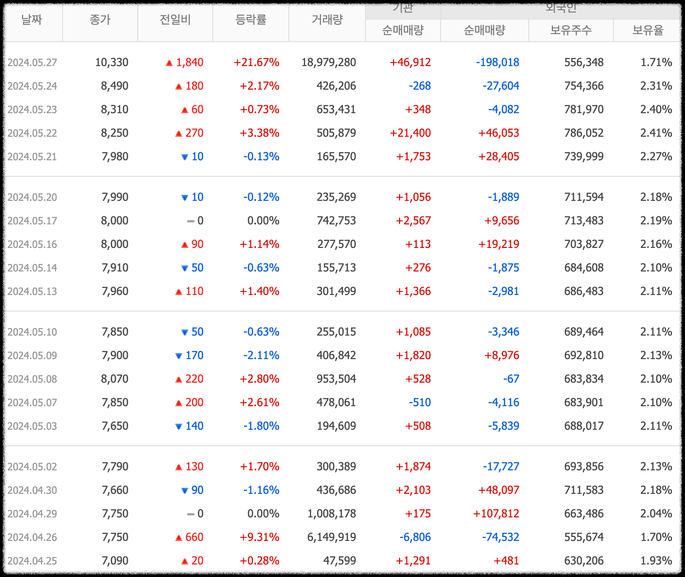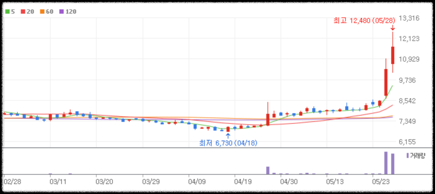 4월 18일 최저주가인 6,730원에서 금일 12,480원까지 2배 이상 주가가 오른 뒤 상승폭이 줄어들고 있는 것을 알 수 있습니다.