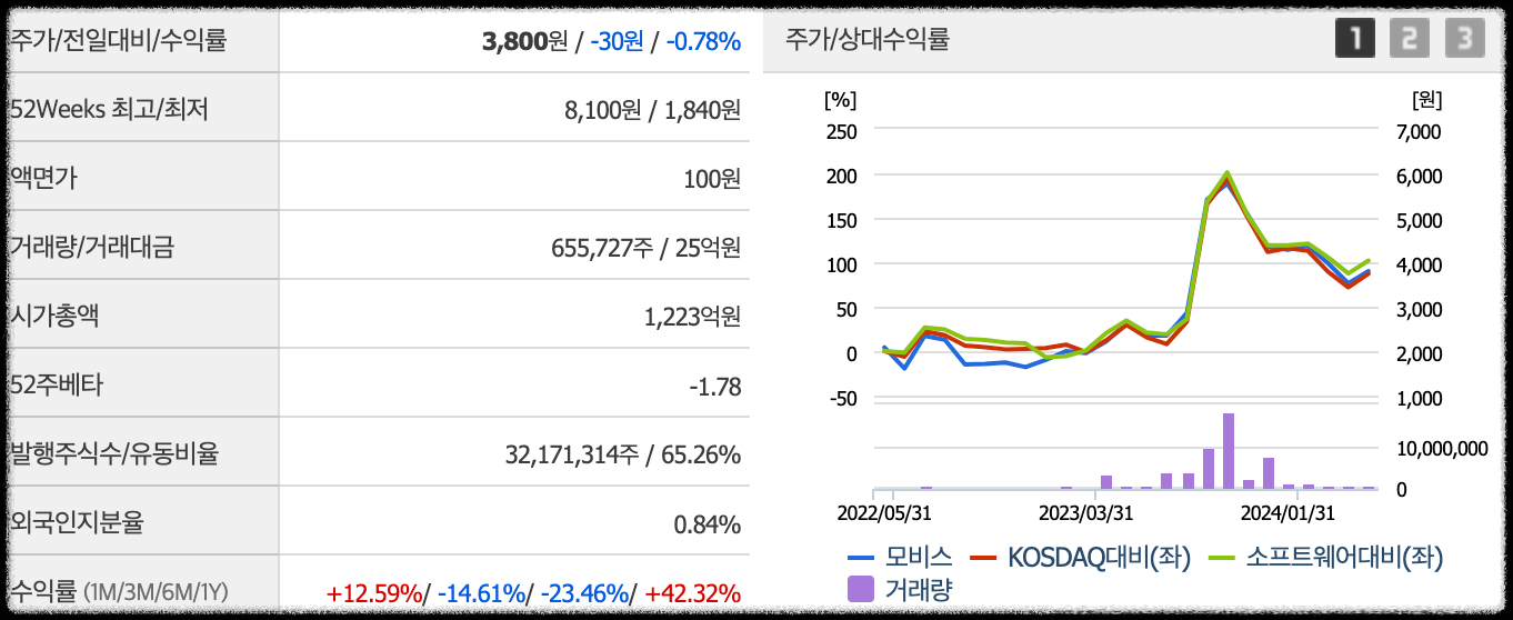 모비스는 한때 초전도체로 인한 부분으로 많은 상승을 하였으며, 코스닥 시가총액 627위이며, 시가총액은 1,345억으로 업종은 생명과학 도구 및 서비스이지만, 원자력, 초전도체 테마로 인하여 주가는 시장에서 움직이고 있습니다. 현재 상장주식수는 32,171,314주이며, 액면가 100원입니다.