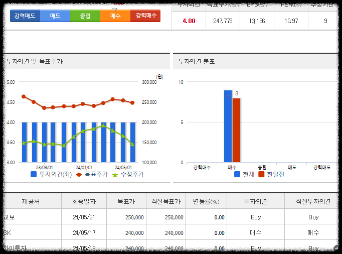교보증권은 목표가 250,000원 매수의견, SK증권, 하이투자증권 240,000원 매수 의견 유지