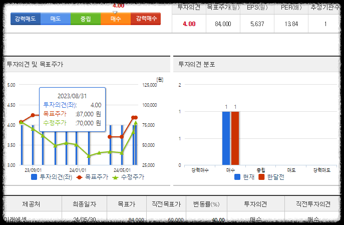 현재 매수의견으로 한달전과 같은 매수 의견 유지, 최종 5월 30일 목표주가 84,000원 상향 되었습니다.