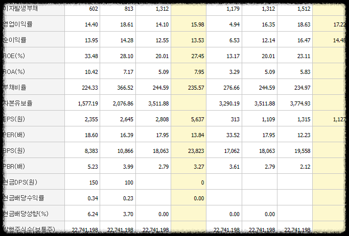 부채는 자산과 매출액이 늘면서 시설 투자하는 부분에 있어서 늘고 있음에 증가하는 추세지만 작년보다 더욱 줄어든 부채 비율을 알수있습니다.