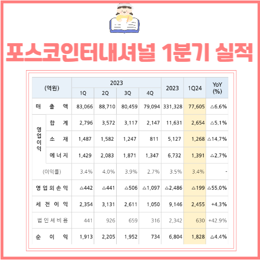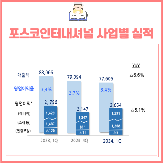 포스코인터내셔널의 '24년 1분기 실적은 다음과 같습니다.