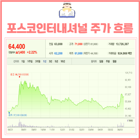 지난해 1년간 포스코인터내셔널 주가 흐름으로는 2023년 7월 26일 2차 전지 상승으로 인하여 52주 최고가인 96,700원까지 상승하였으며, 올해 2024년 4월 19일에 최저 주가인 41,550원까지 하락을 하였습니다.