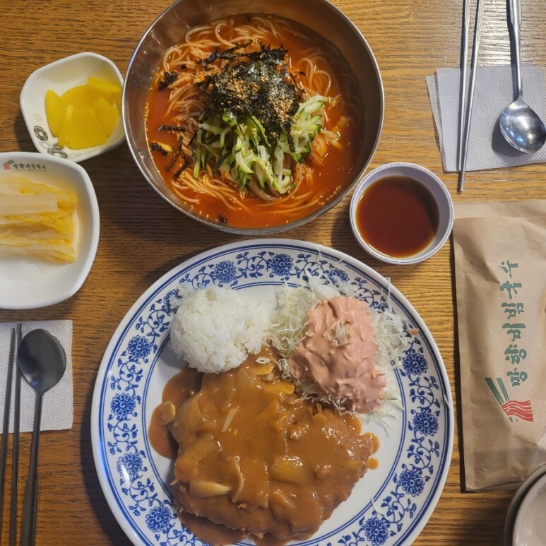 시킨 메뉴가 나온 망향 비빔국수 시그니쳐 비빔물국수와 수제 돈까스입니다. 딱 봐도 먹음직스러운 비쥬얼