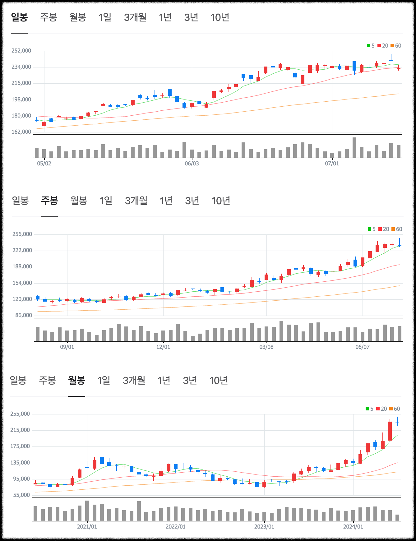 월봉 차트를 보았을 때는 현재 이동평균선보다 주식의 가격이 높게 위치함에 있어서 여전히 상승추세는 유지하고 있으나, 이동평균선끼리의 이격거리가 넓어지고 있음에 대한 리스크는 조심해야 할 것으로 보입니다.