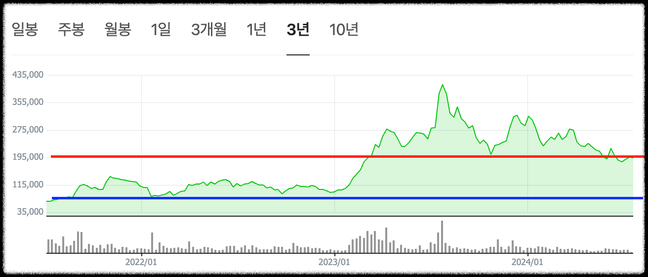 에코프로비엠 3년 차트 흐름을 보았을 때는 현재 2년 주식 가격 중 중간에 위치하고 있는 것을 알 수 있으며, 주가 전망이 그리 좋다고 볼 수 없습니다.