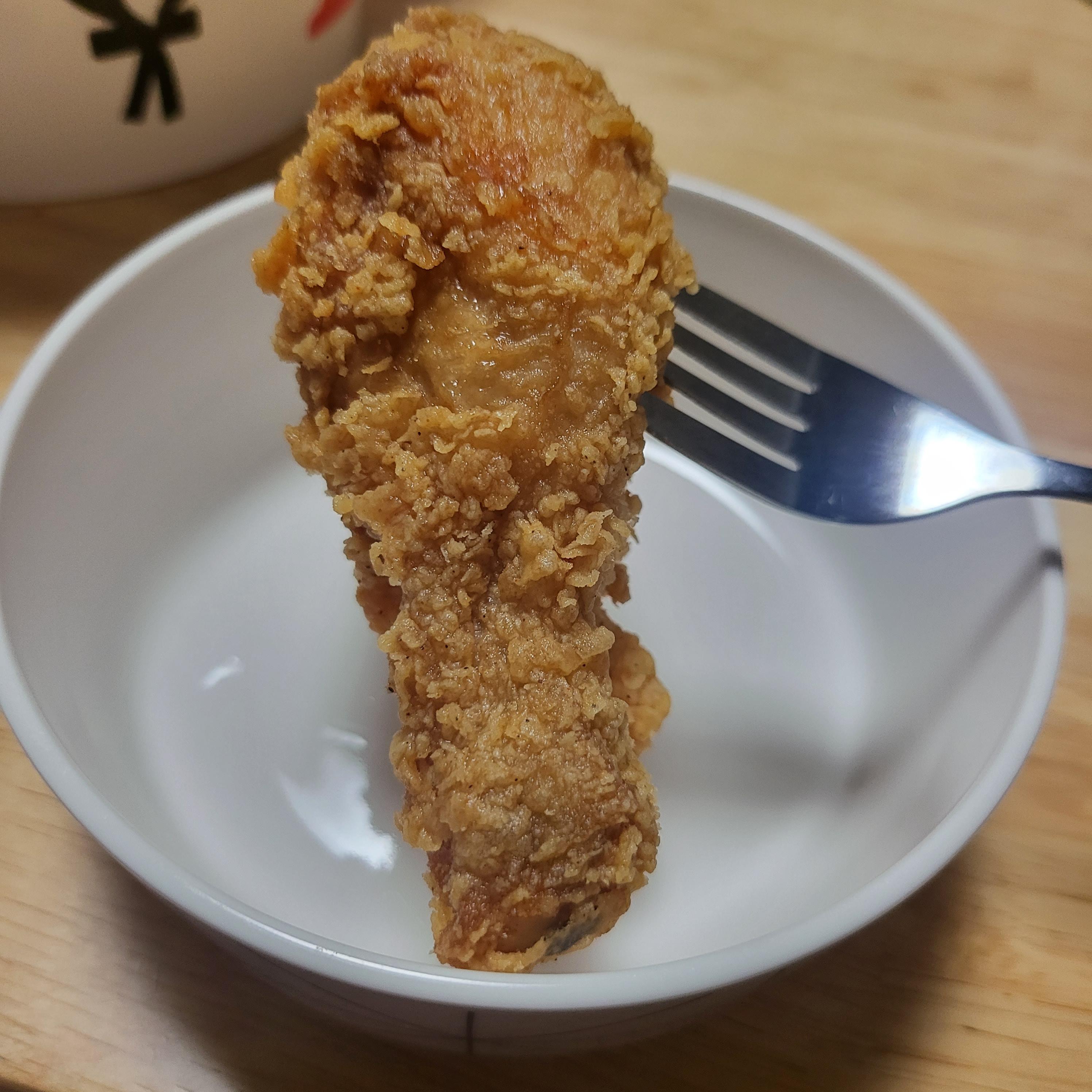 닭다리부터 뜯기전에 모습입니다. 크리스피라 일반 후라이드랑 달리 껍질부분이 바삭하고 맛있었어요..