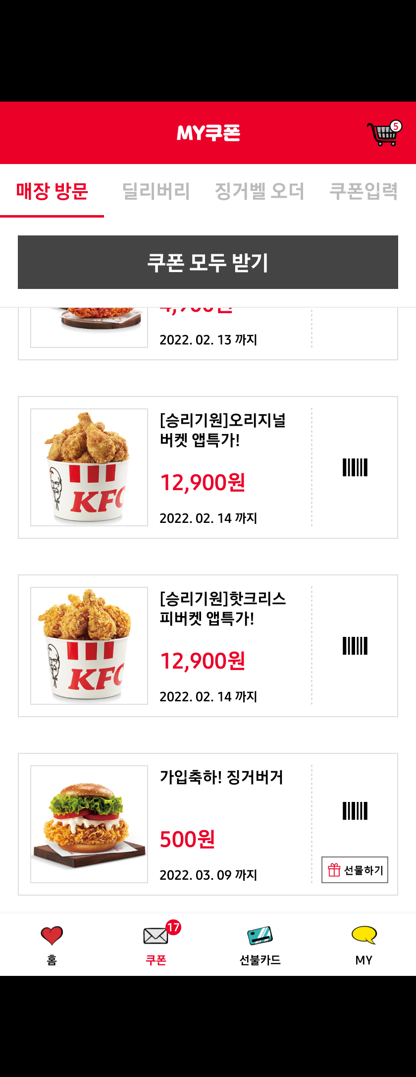 KFC 어플깔고 회원가입만 하면 쿠폰이 수두룩