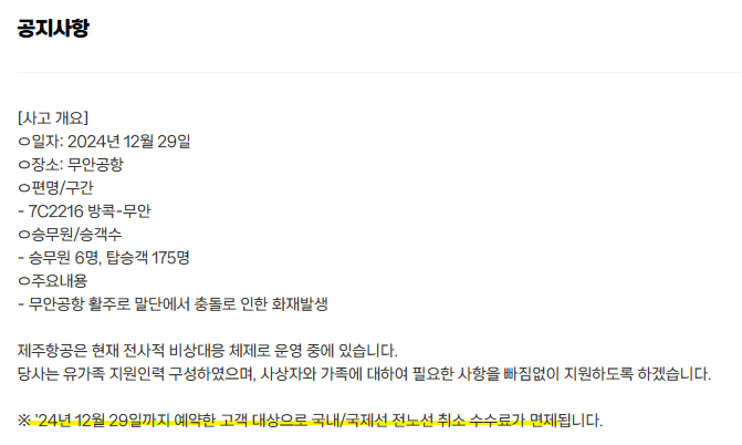 이번 무안공항 사고로 인해서 2024년 12월 29일까지 예약한 고객 대상으로 국내 및 국제선 전노선 취소 수수료가 면제가 된다고 합니다.