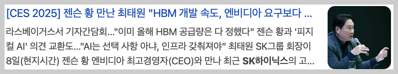 또한, 최태원 회장과의 미팅에서 젠슨황의 SK하이닉스 HBM 개발속도를 더 빠른 요구를 하면서 SK하이닉스에 대한 애정을 더욱 많이 드러낸 부분이 더욱 주가에 영향을 많이 미친것으로 보이고 있습니다.