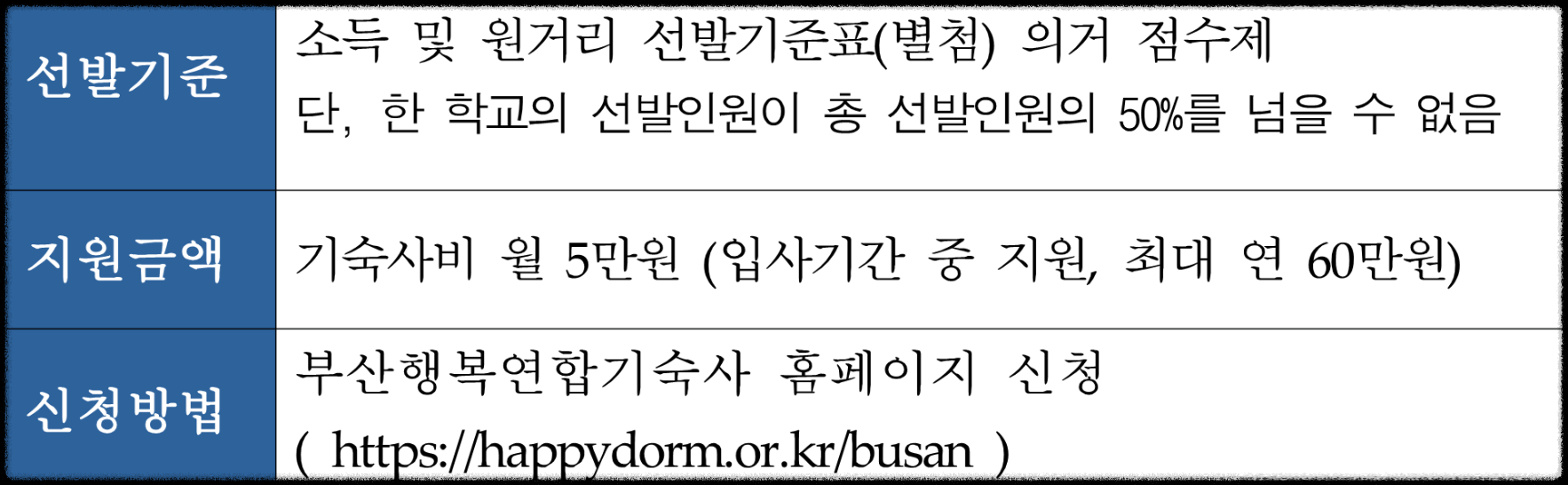 이번 글에서 부산 행복기숙사 기숙사비 지원 대상 및 신청 방법, 지원 금액까지 같이 알아보도록 하겠습니다.