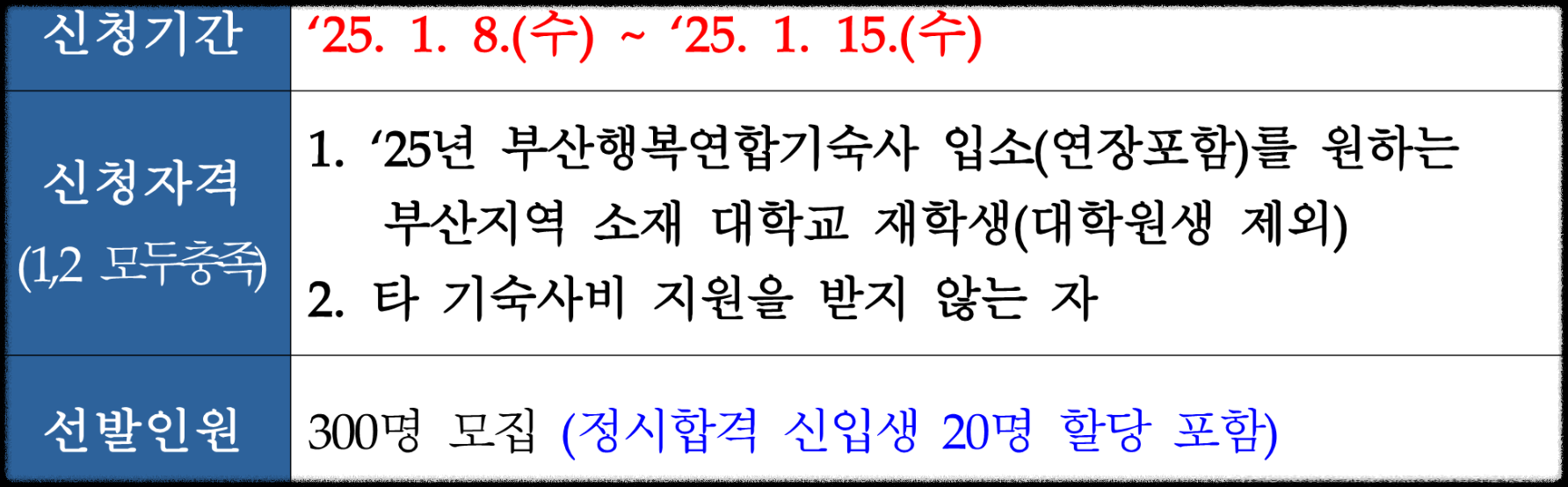 1. 25년 부산행복연합기숙사 입소(연장포함)를 원하는 부산지역 소재 대학교 재학생 (대학원생은 제외)