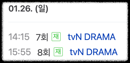 OTT가 아닌 tvN 재방송으로 시청을 하실 분은 설 명절 연휴 동안 시청을 할 수 있으며, 아래의 편성 시간을 확인하여 재방송을 사수하시는 것을 추천드립니다.