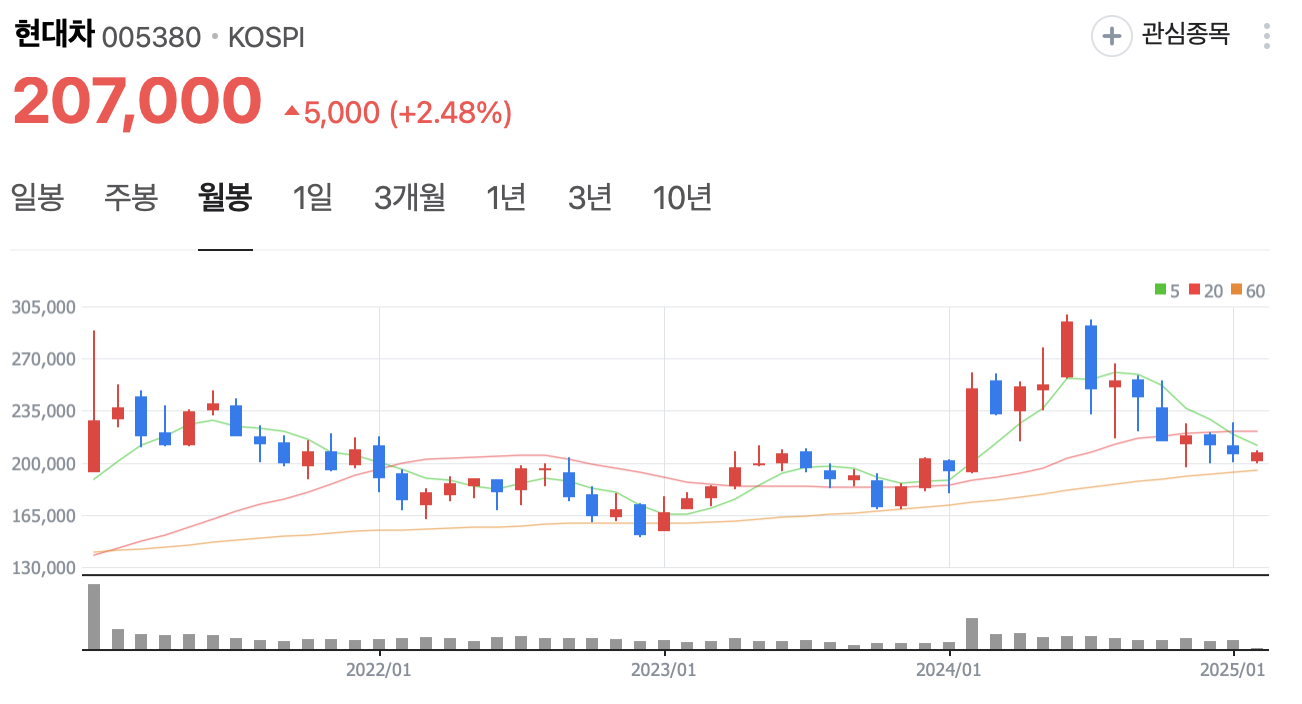 2025년 2월 현재, 현대차 주가는 207,000원으로 +2.48% 상승 중에 있습니다. 전기차 성장 기대감과 수출 실적 개선으로 성장을 보이는 도중 관세 전쟁을 통해서 하락을 하였지만 다시 회복을 하고 있는 것을 알 수 있습니다.