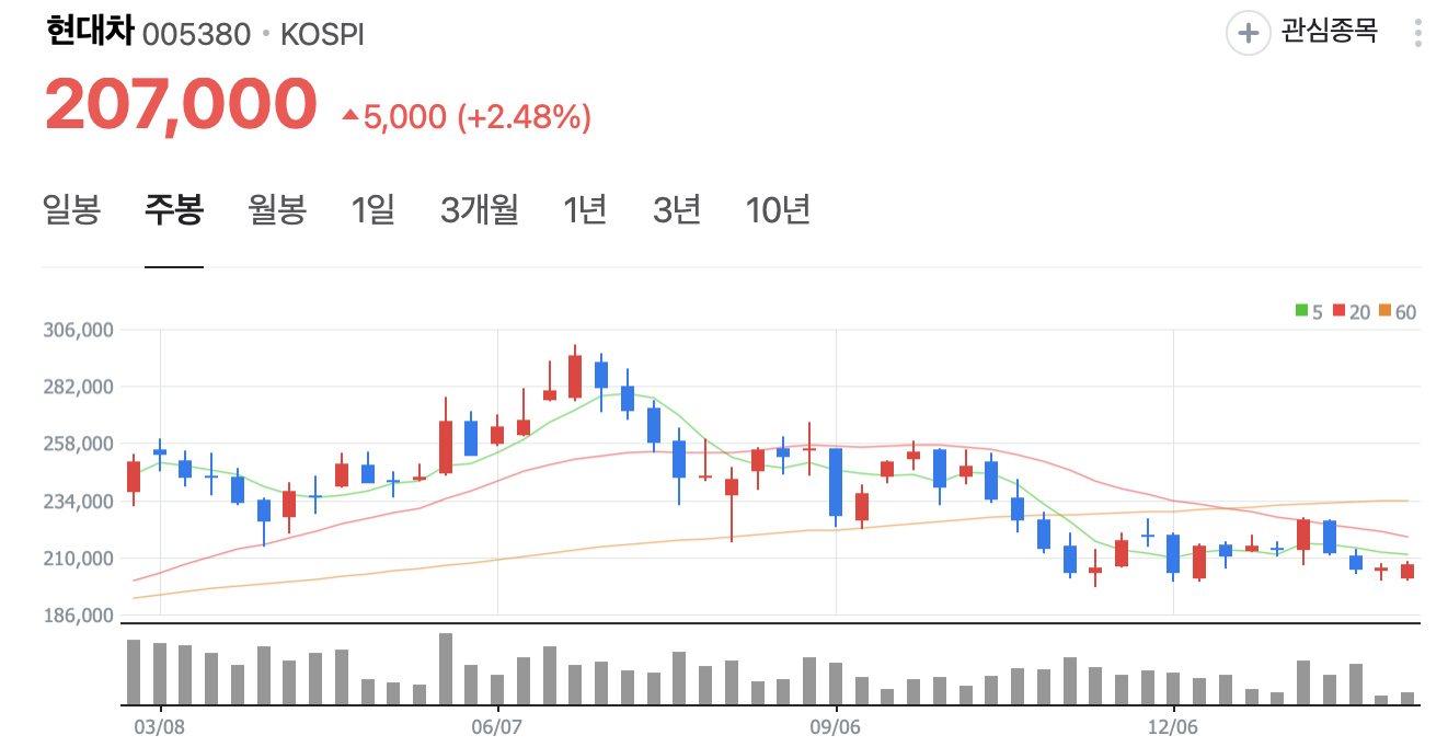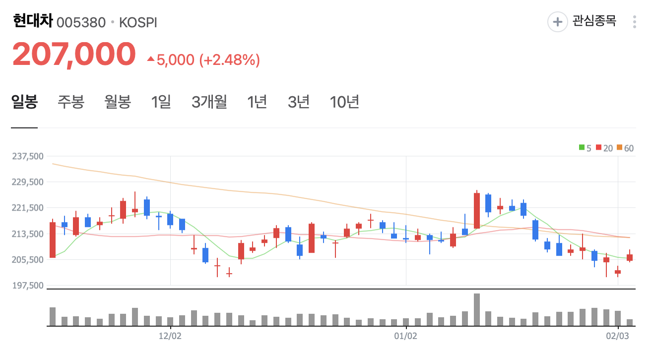 2025년 2월 현재, 현대차 주가는 207,000원으로 +2.48% 상승 중에 있습니다. 전기차 성장 기대감과 수출 실적 개선으로 성장을 보이는 도중 관세 전쟁을 통해서 하락을 하였지만 다시 회복을 하고 있는 것을 알 수 있습니다.