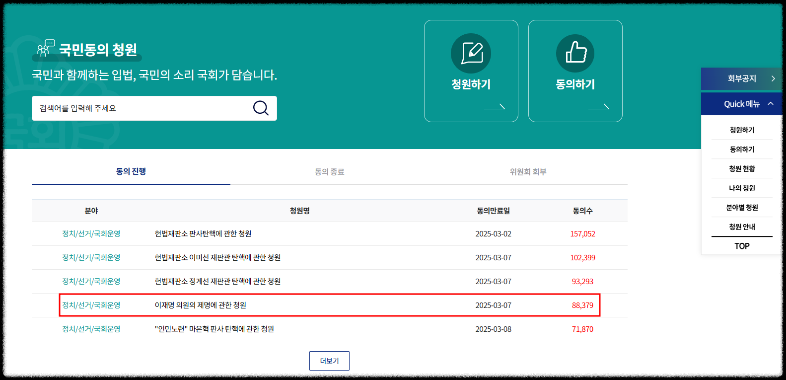 현재 윤석열 대통령의 탄핵 변론을 앞두고 이재명 의원의 제명에 관한 청원으로 현재 동의수는 8만 8,000명으로 많은 사람들이 동의를 하고 있습니다.