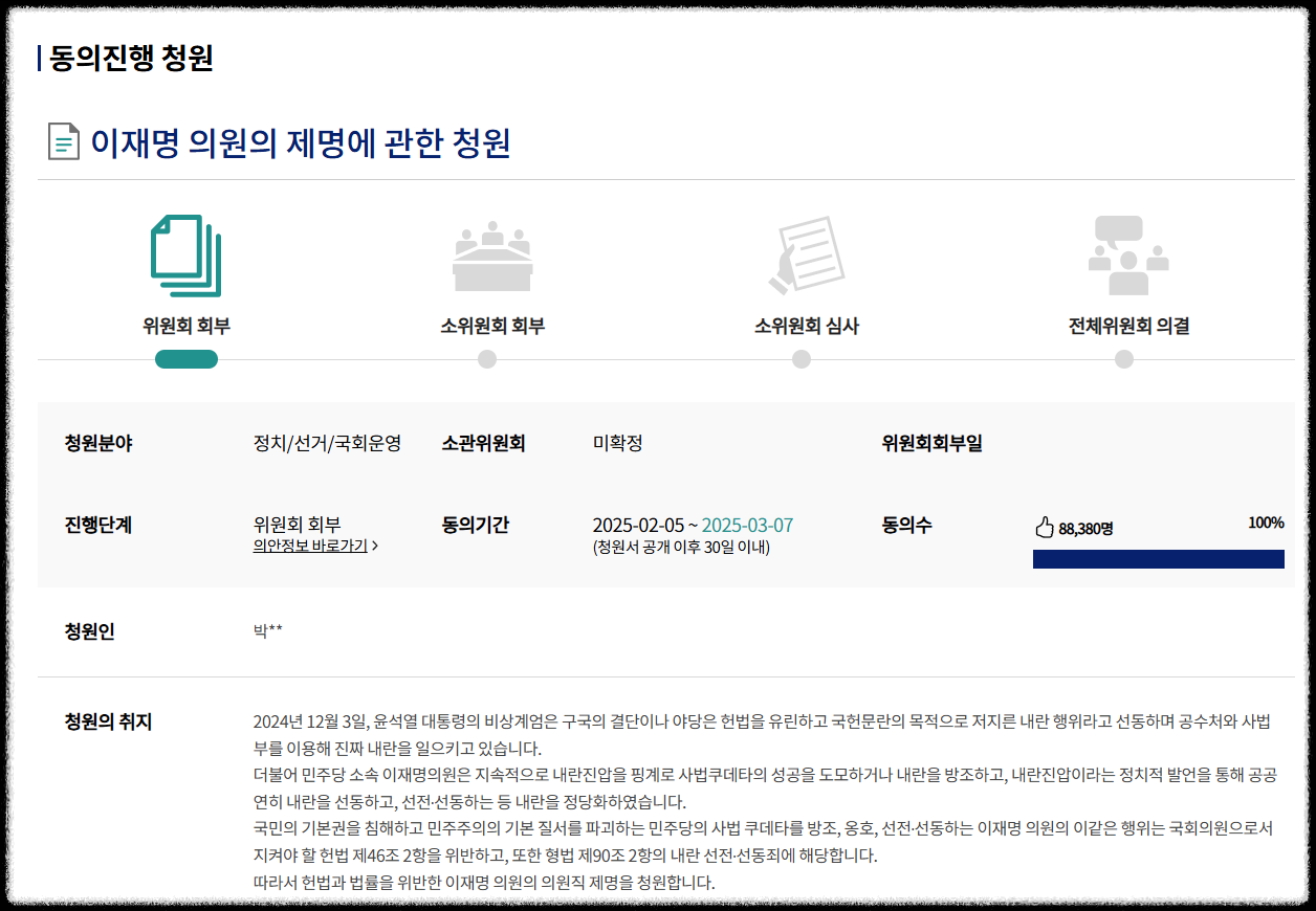 이재명 의원의 제명에 청원 국회전자 청원사이트 국가 내란 혐의 8만 명이상 동의한 이유