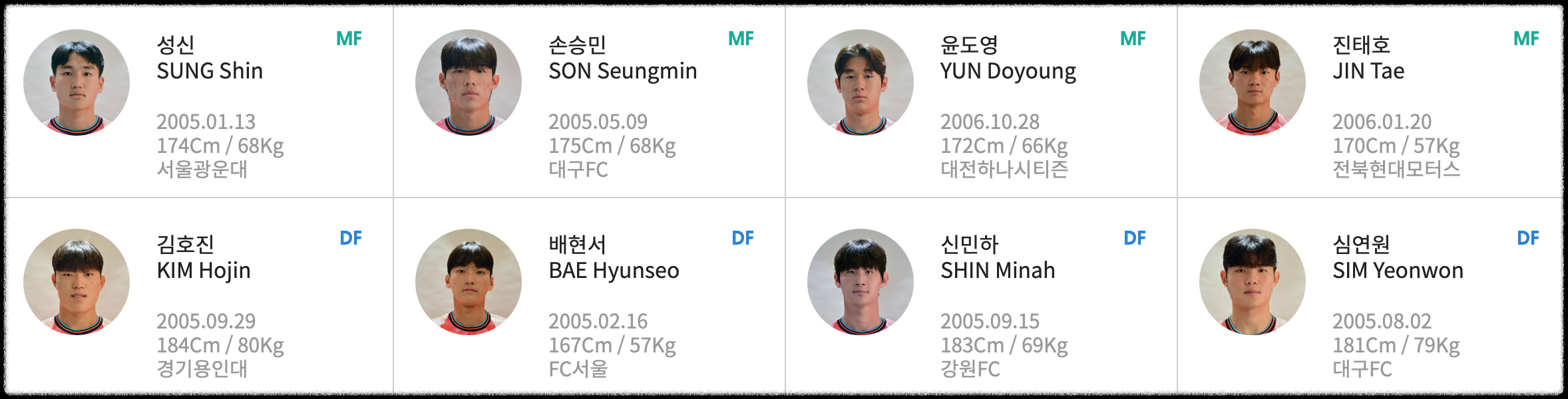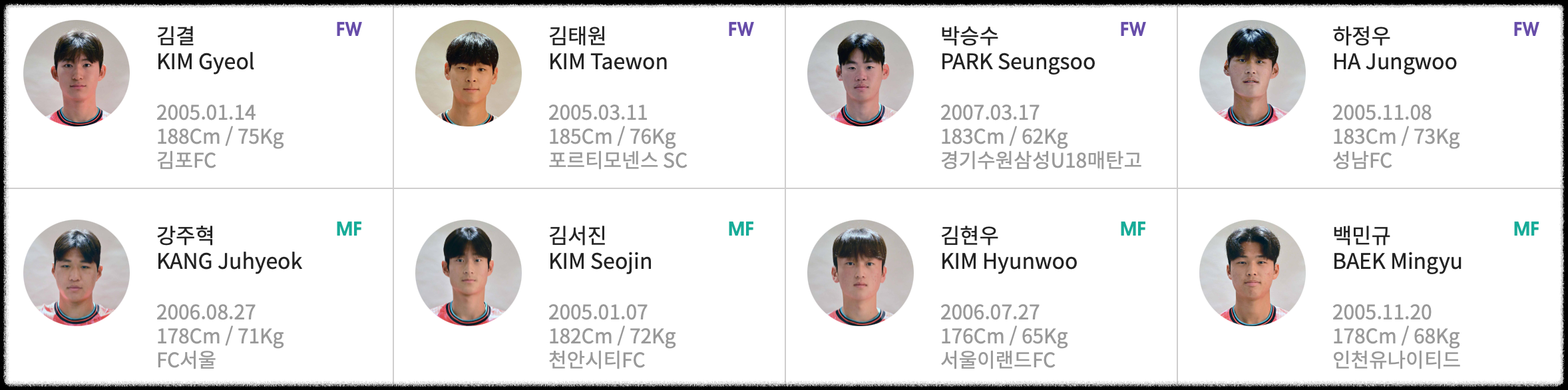 대한민국 대표팀은 강력한 유망주들로 구성이 되어있고, 주요 키플레이어 선수는 다음과 같습니다.