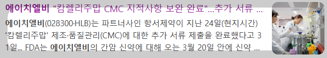 하지만 최근, 글로벌 계열사인 항서제약이 미국 FDA에 CMC 보완자료를 제출을 하면서 3월 허가 여부 결론에 대한 기대감으로 에이치엘비는 주가가 현재 많은 변동성이 있는 것을 알 수 있습니다.