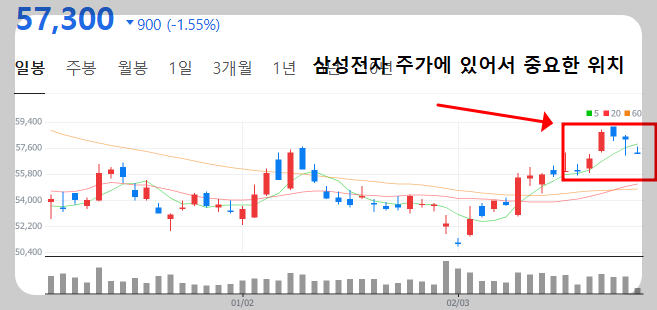 이로 인해, 삼성전자 일봉 차트 전망을 살펴보면 5일선 아래에 있지만, 다른 반도체 주식인 SK하이닉스보다는 많이 빠지지 않고 잘 버텨주고 있는 것을 할 수  있습니다. 현재 이 부분으로 인해지지를 하고 반등을 한다면, 다시 6만 원까지 상승할 수 있는 원동력이 될 수 있지만, 하락을 하게 된다면 다시 55,000원대로 하락을 할 수 있기 때문에 이 부분을 이번 주 유심히 살펴보아야 합니다.