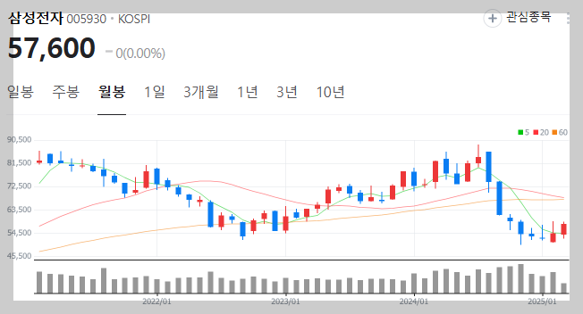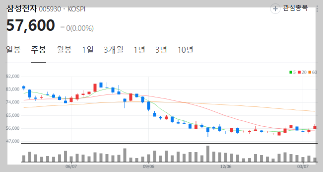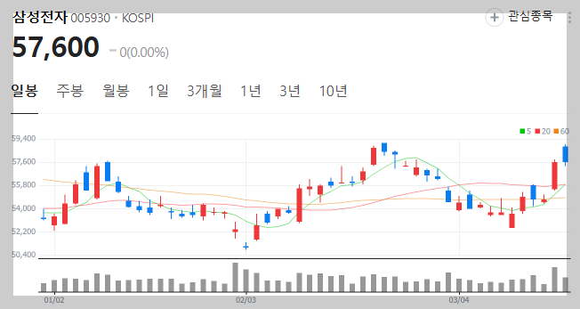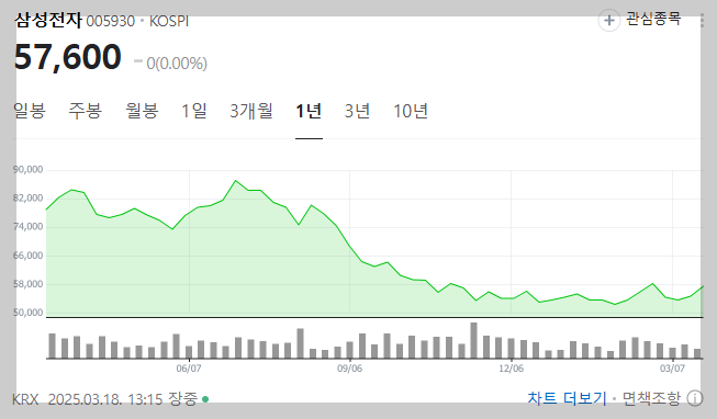 📌 2025년 3월 17일 기준, 삼성전자 주가는 57,600원으로 전일 대비 5.30% 상승 마감을 하였고, 18일 기준으로도 상승을 하고 있는 것을 알 수 있습니다.