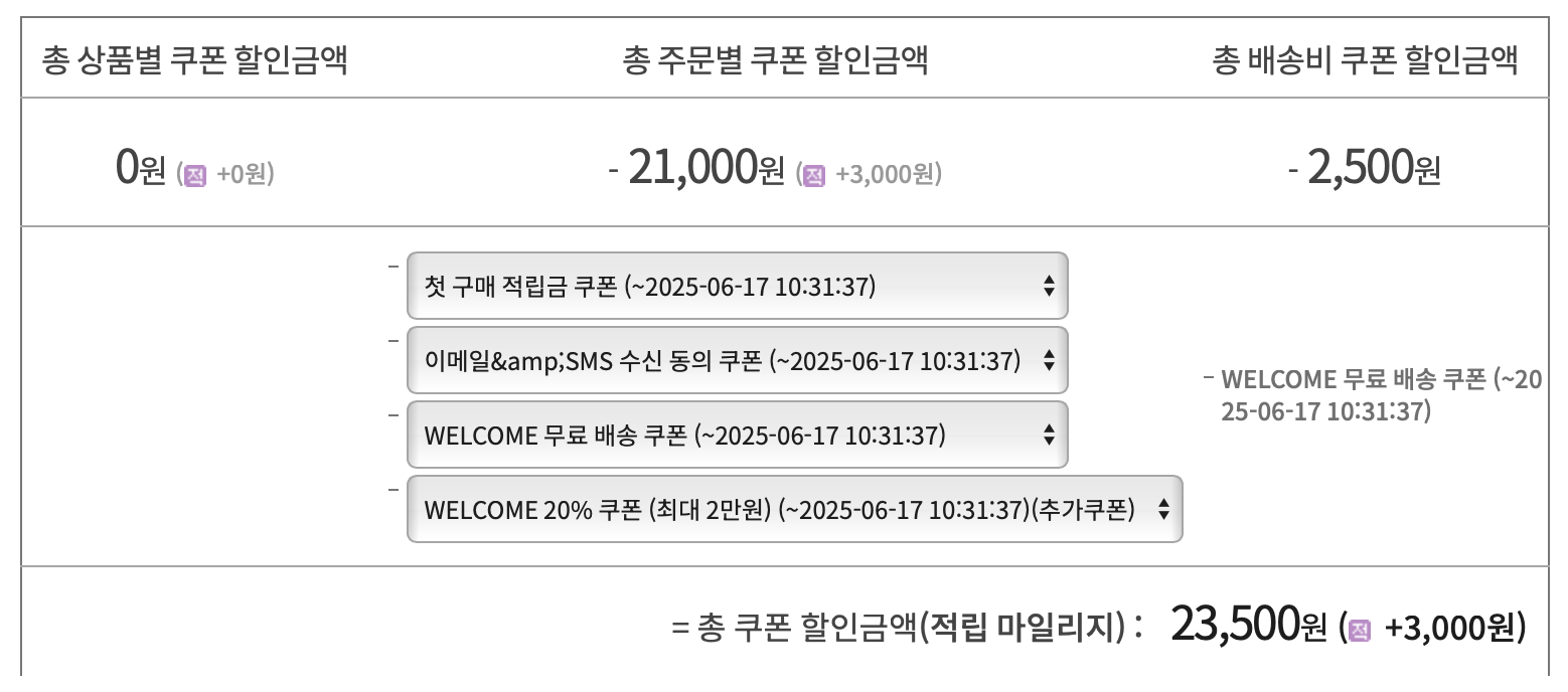 할인 및 쿠폰 적용은 아래의 사진과 같이 동일하게 적용을 하면 더욱 편리하게 사용할 수 있습니다.