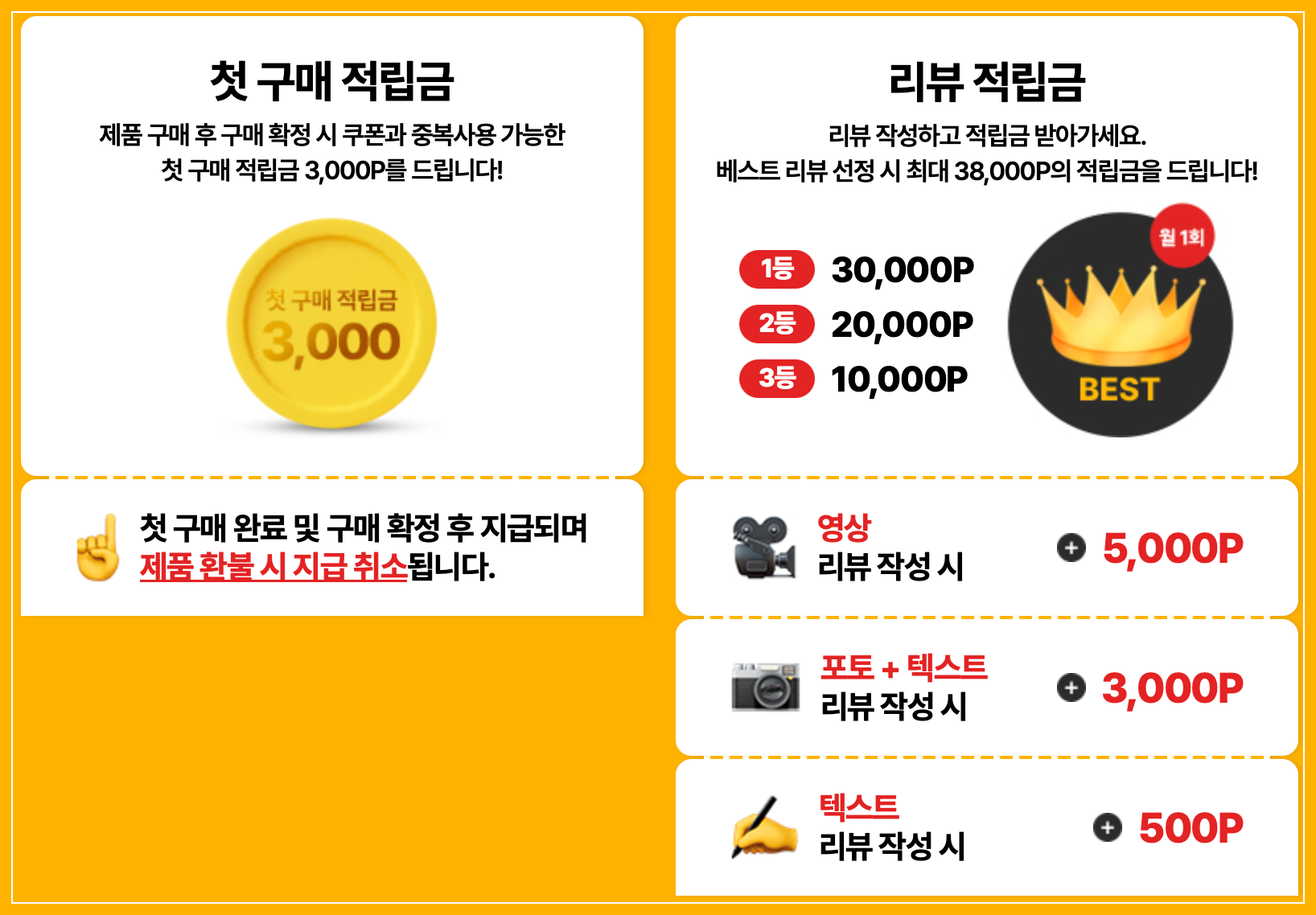 • 첫 구매 및 리뷰 적립금