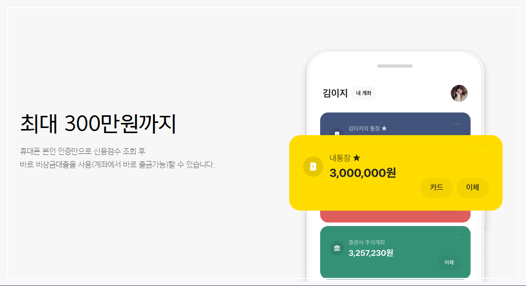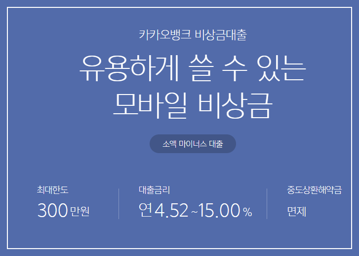 카카오뱅크 비상금대출직업이나 소득에 관계없이 만 19세 이상의 내국인이라면 누구나 신청할 수 있는 소액 대출 상품입니다. 최대 300만 원까지 대출이 가능하며, 마이너스 통장 방식으로 필요할 때 자유롭게 자금을 활용할 수 있습니다.