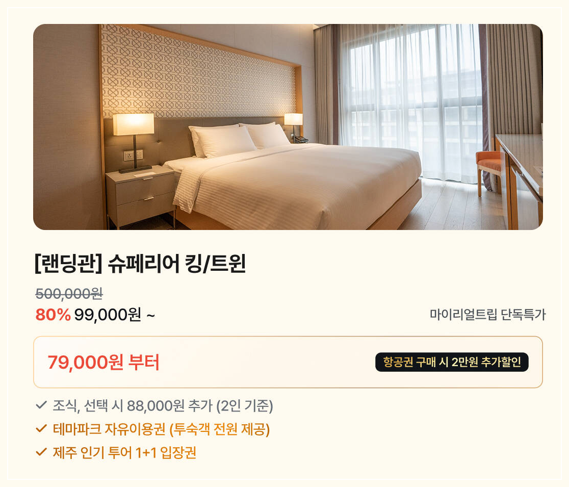 현재 제주 신화월드 리조트 특가 예약 방법 중 가장 할인율이 높은 플랫폼은 "마이리얼트립"입니다. 26일부터 마이리얼트립 제주 신화월드 특가 사전 알림 신청을 할 수 있으며, 특가 알림을 신청해두면 가장 먼저 특가 오픈 소식으로 할인 된 가격을 만나볼 수 있습니다.