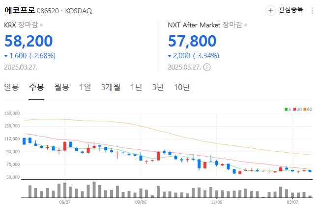 투자자 매매동향 중 외국인들은 매도를 하는데 기관들은 2025년 3월 14일부터 1거래일 빼고 계속 대량 매수를 하고 있는 것으로 보아서, 에코프로에 비중을 높이는 모습을 보여주고 있습니다.