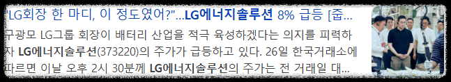 또한, 3월 26일의 경우에는 구광모 회장 한마디에 LG에너지솔루션 주가가 8% 상승을 하며 급등한 것을 보여주기도 하였습니다. -> 급등 이유 확인하기
