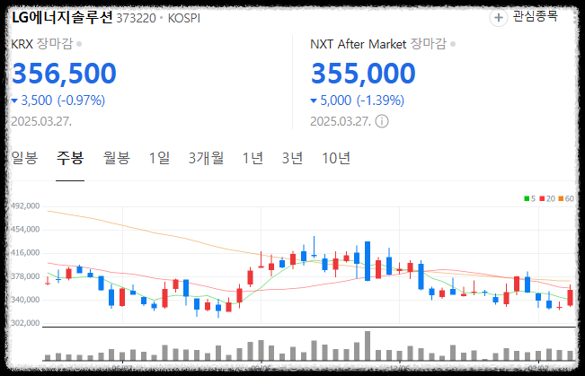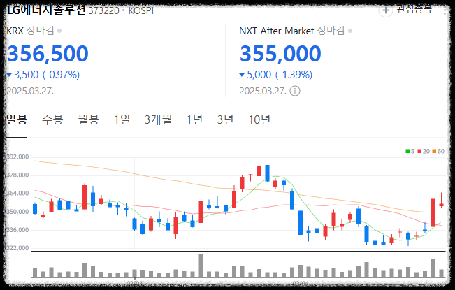 2025년 3월 27일 기준, LG에너지솔루션의 주가는 ₩356,500를 기록하고 있습니다. 이는 최근 3개월간 약간 상승한 수치로, 전기차 시장의 성장과 함께 투자자들의 관심이 지속되고 있음을 보여줍니다.