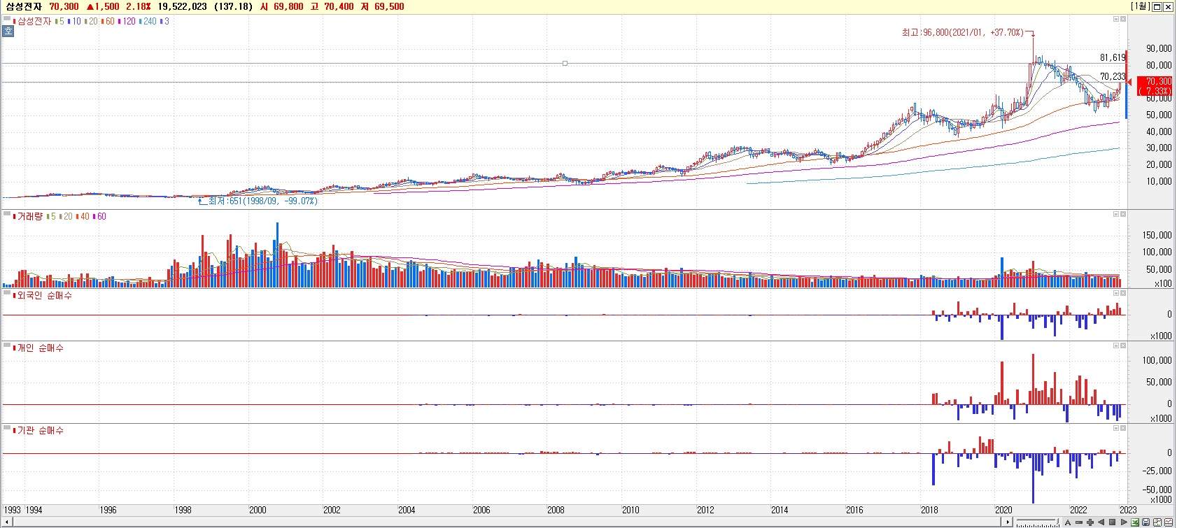 마지막으로 삼성전자 월봉을 보겠습니다.