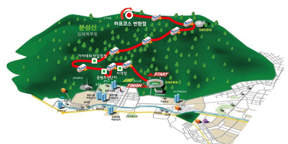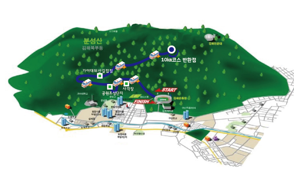 10km코스는 분성산 위 반환점이 있으며, 코스는 김해운동장 → 사격장 → 야구장 → 삼계근린공원 → 김해천문 대 전 반환 → 삼계근린공원 → 야구장 → 사격장 → 김해운동장 으로 구성이 되어있습니다.