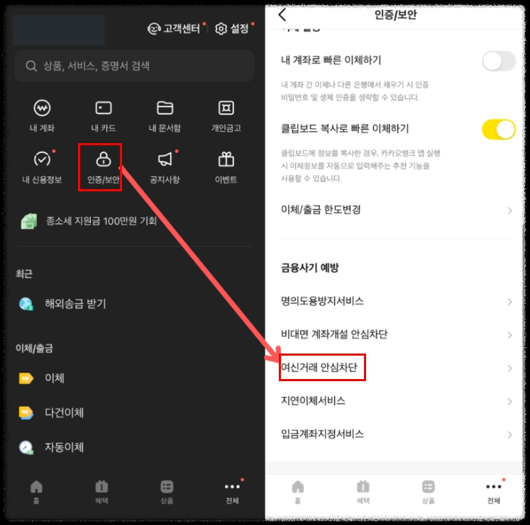 여신거래 안심차단 서비스 비대면 신청 방법 (카카오뱅크)