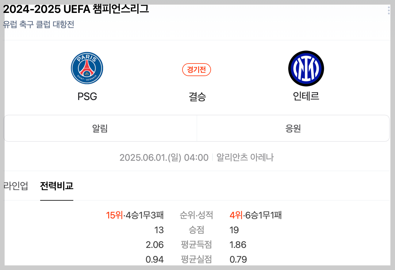 해외축구를 좋아하고 PSG  또는 인테르를 응원하는 팬이라면 이번 결승전을 정말 놓치지 말고 시청을 하는 것을 추천드립니다.