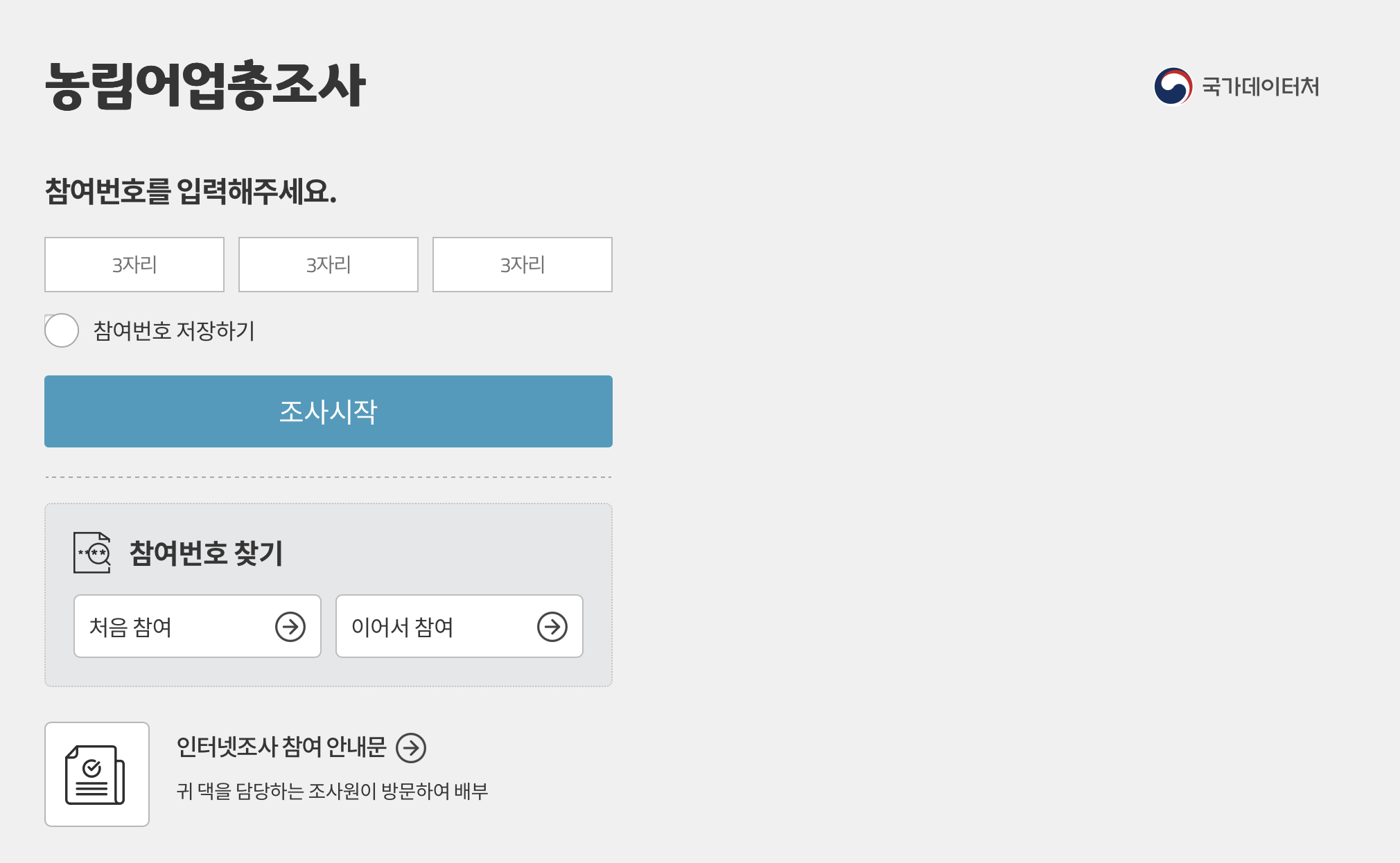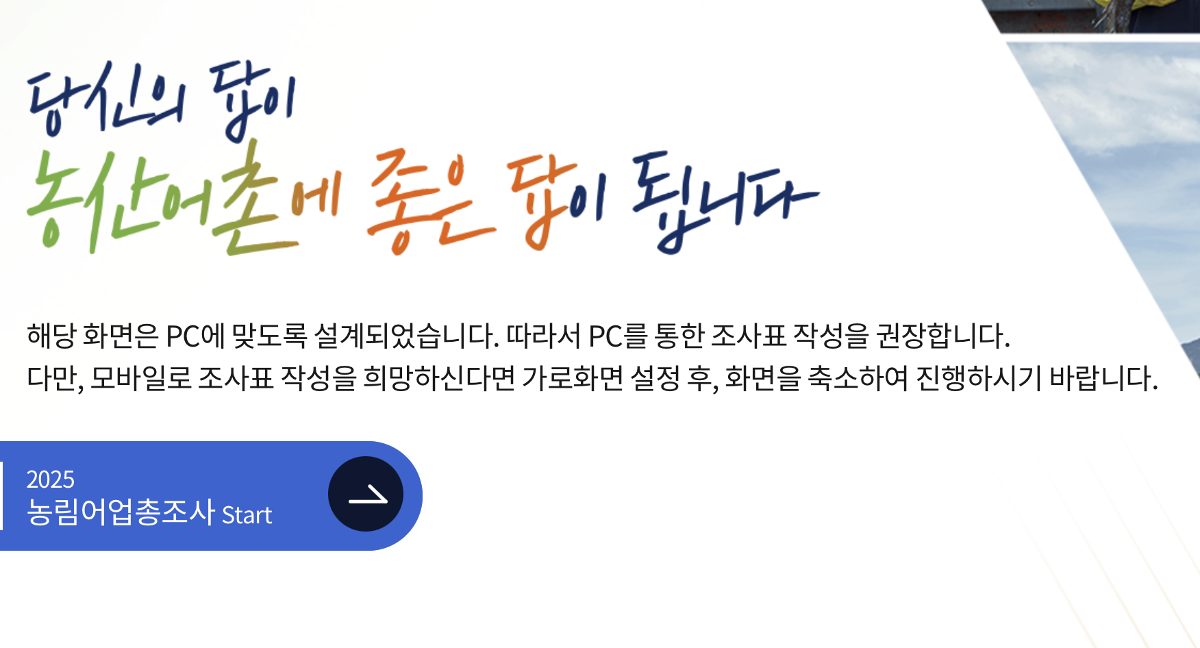 농림어업 총조사는 농가·임가·어가의 현황과 경영 실태를 파악해 농업·임업·수산업 정책에 직접 반영되는 중요한 국가 통계조사입니다. 최근에는 종이조사 대신 홈페이지·모바일 인터넷을 통해 직접 참여할 수 있게 되어, 참여가 더 쉽고 간편해졌습니다. 정부는 먼저 인터넷조사를 진행하고, 미참여 가구에 한해 조사원이 직접 방문하는 방식을 사용하고 있습니다. 이 글에서는 공식 홈페이지에서 참여하는 방법을 단계별로 안내합니다.